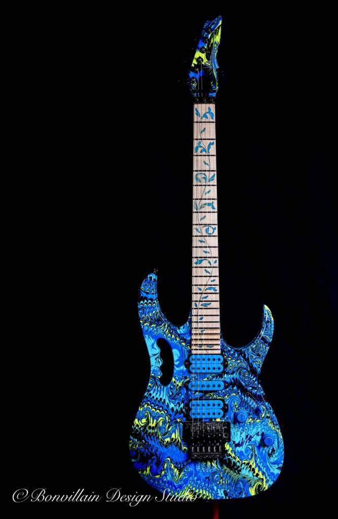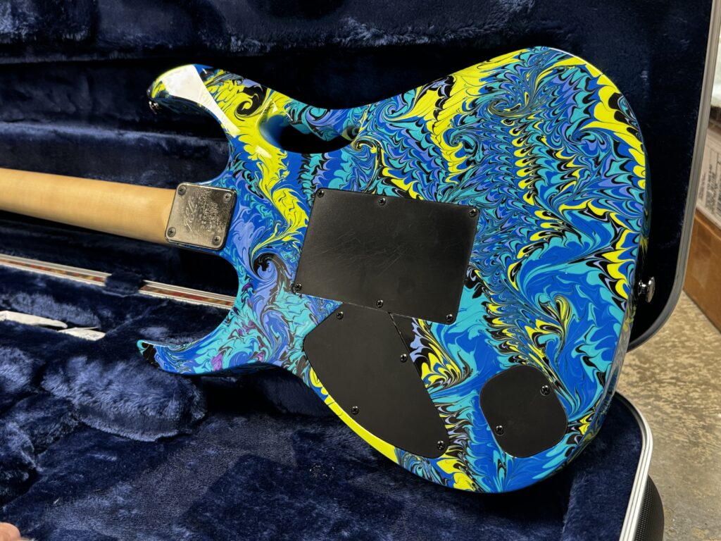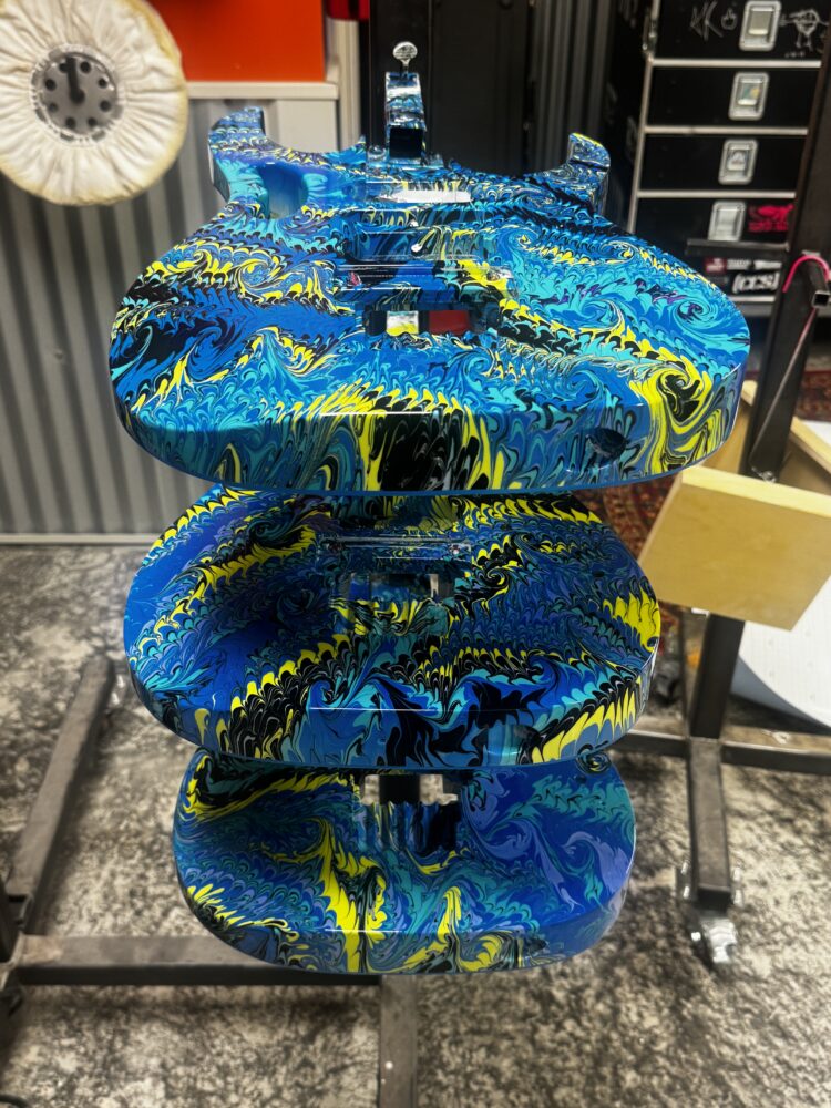 The original finishes on these things was THICK…we strip all of that off down to wood. Then fix any dents/chips/etc. in the wood and shoot a rock-hard white sealer as a base. Then Day-Glo blue for the striping, and then paint it back/front. Clear is 6 coats of acrylic urethane that is cut and buffed to a high-gloss finish. Any hardware that is not original or worn is replaced and necks are cleaned up and either refretted (if they have to be) or set up with a nice level/crown/polish. Kinda like a brand new Jem from 1991 🙂