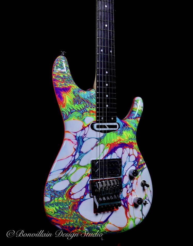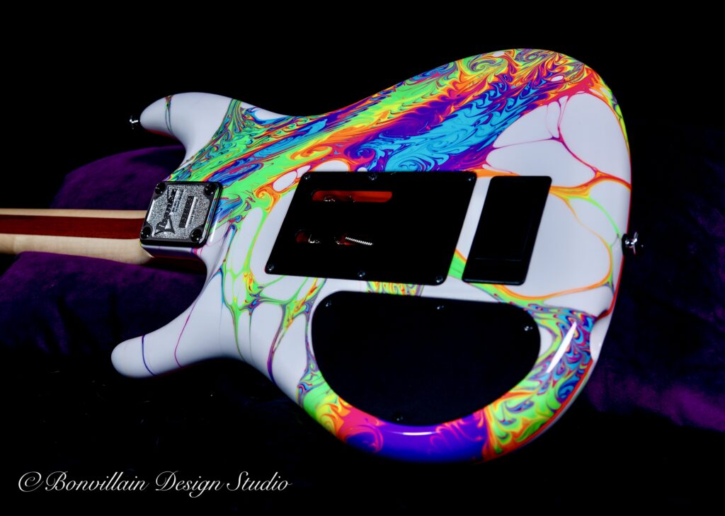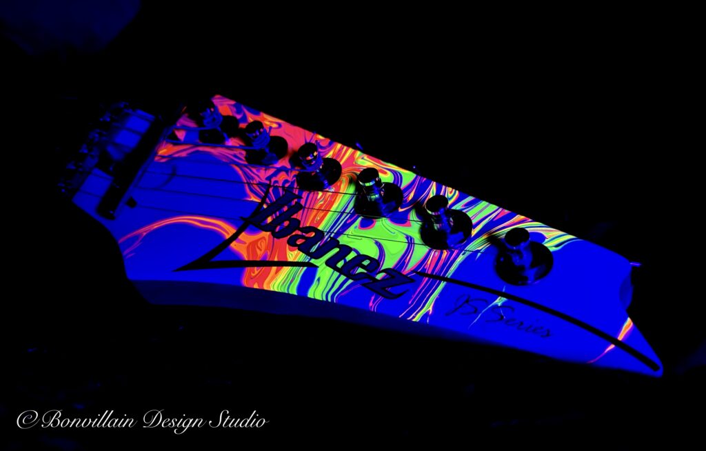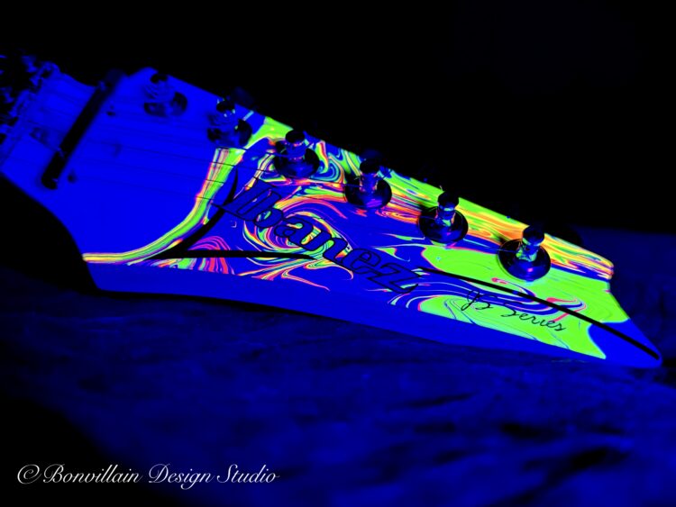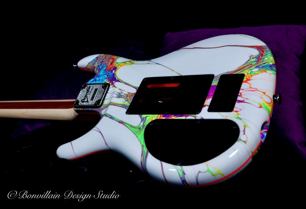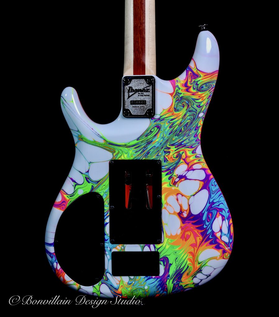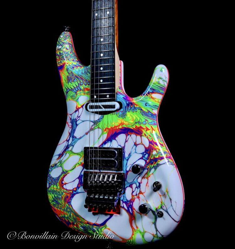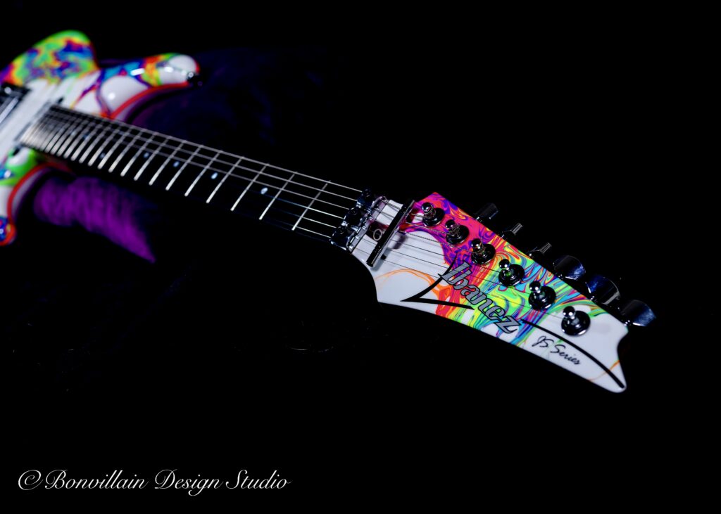 We love Joe. He’s been an inspiration, a friend, and collaborator and the JS is one of my favorite guitars – both to play and to work on. So we decided to do an in-house mini-run. BDS acquired 30 new Ibanez JS2480’s, stripped them down, and built them back up into something a little more unique. I love the stretched out, stringy designs (traditionally referred to as a ‘fantasy’ style design…maybe a little ‘Italian Vein’…but given that what I do deviates pretty heavily from ‘traditional techniques’ – I call it Unicorn Splatter in guitarbling world :-)) and the JS model lends itself well to that look. Also Joe and I did a charity piece together that was similar and I really liked that guitar, so figured I would make 20 more 🙂