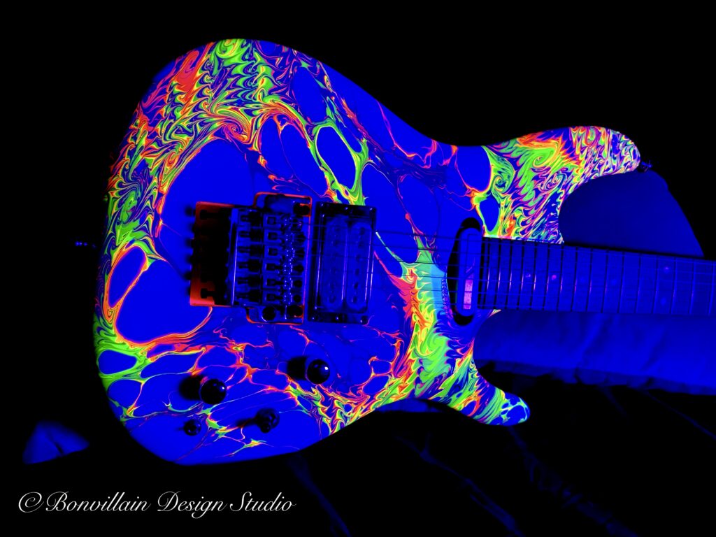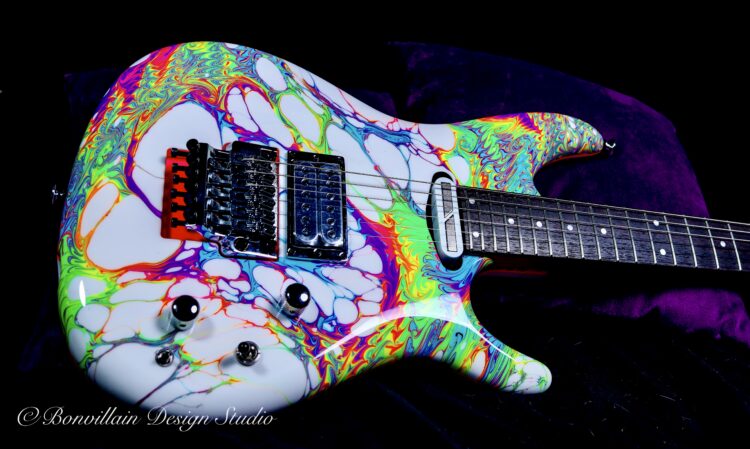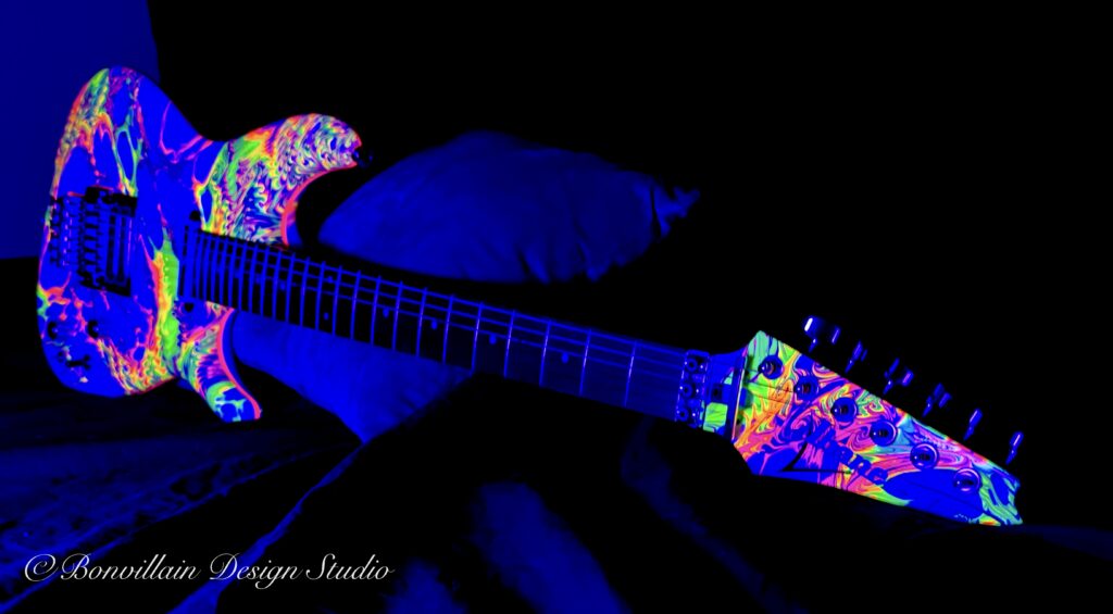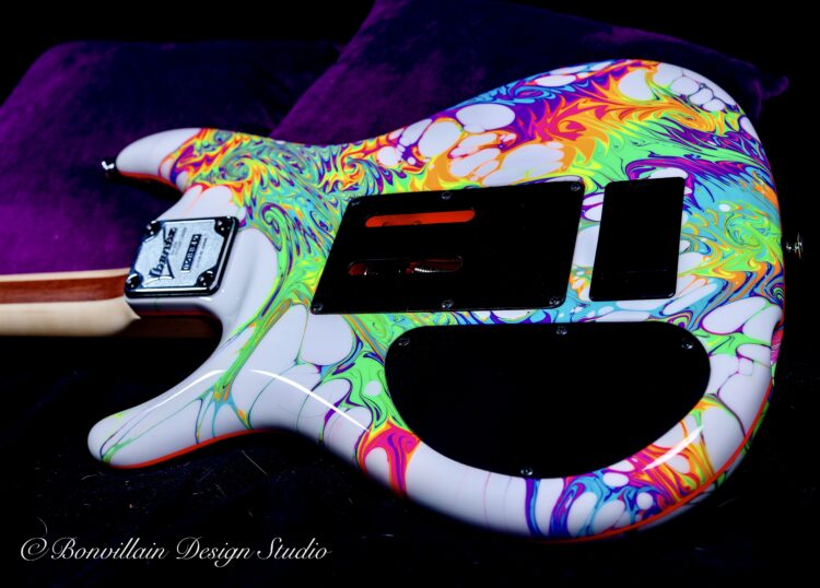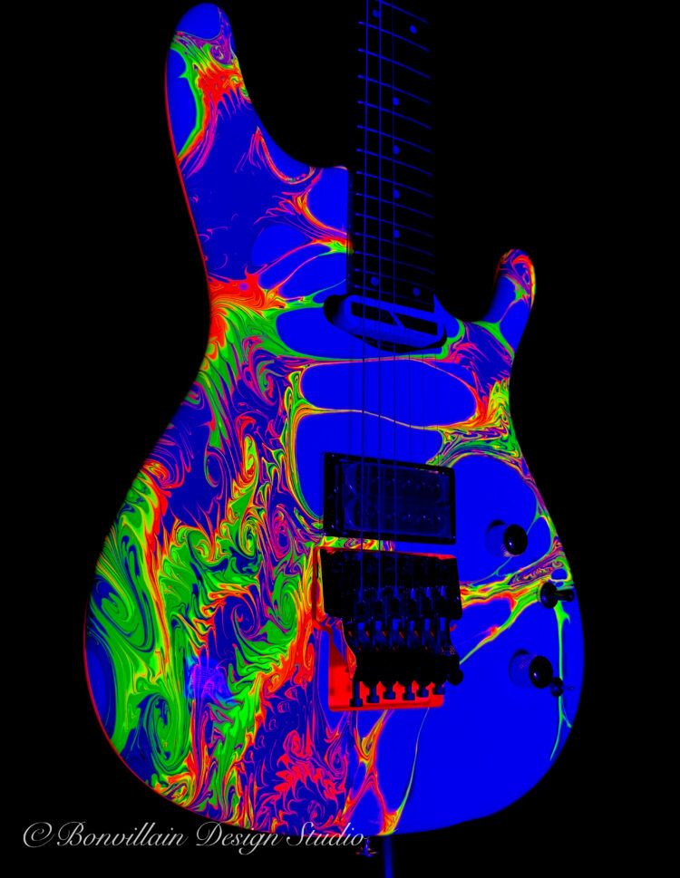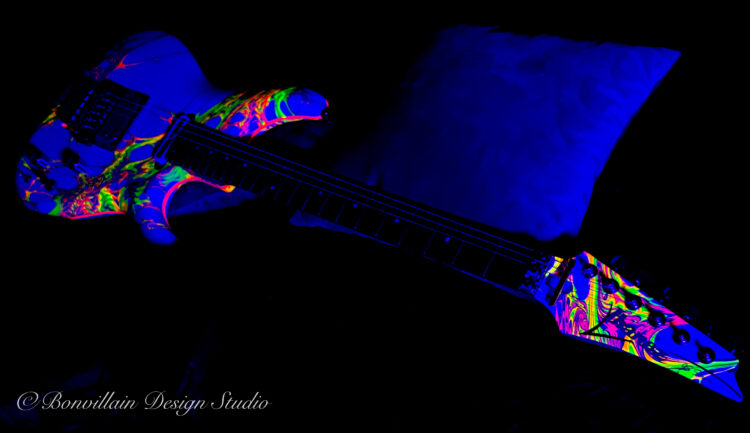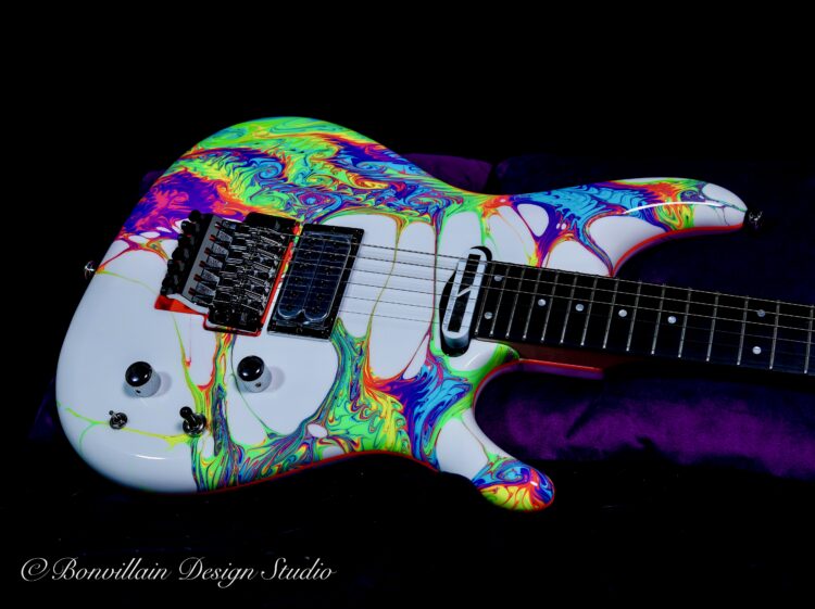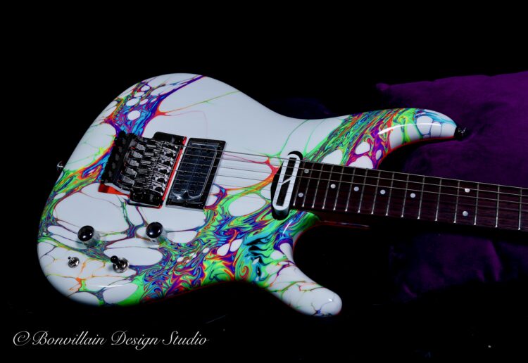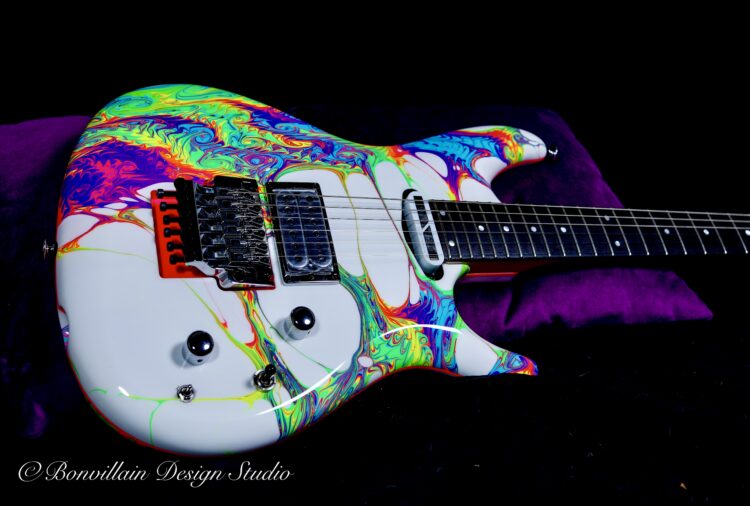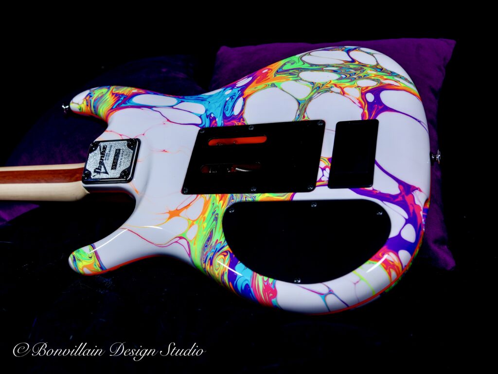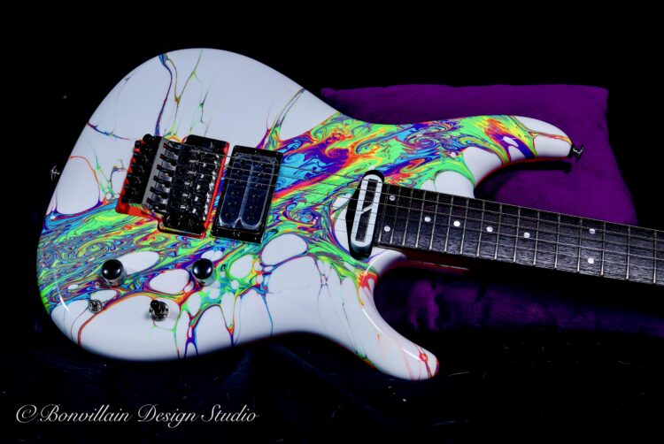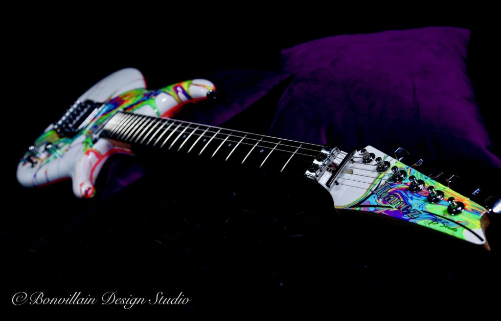 We love Joe. He’s been an inspiration, a friend, and collaborator and the JS is one of my favorite guitars – both to play and to work on. So we decided to do an in-house mini-run. BDS acquired 30 new Ibanez JS2480’s, stripped them down, and built them back up into something a little more unique. I love the stretched out, stringy designs (traditionally referred to as a ‘fantasy’ style design…maybe a little ‘Italian Vein’…but given that what I do deviates pretty heavily from ‘traditional techniques’ – I call it Unicorn Splatter in guitarbling world :-)) and the JS model lends itself well to that look. Also Joe and I did a charity piece together that was similar and I really liked that guitar, so figured I would make 20 more 🙂